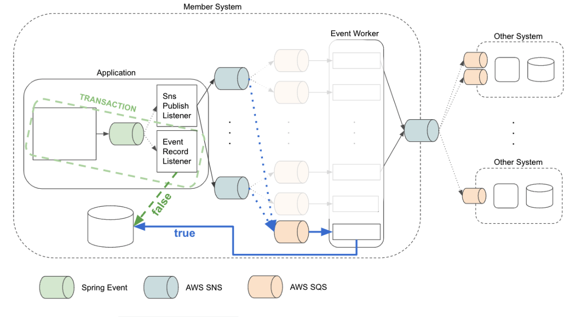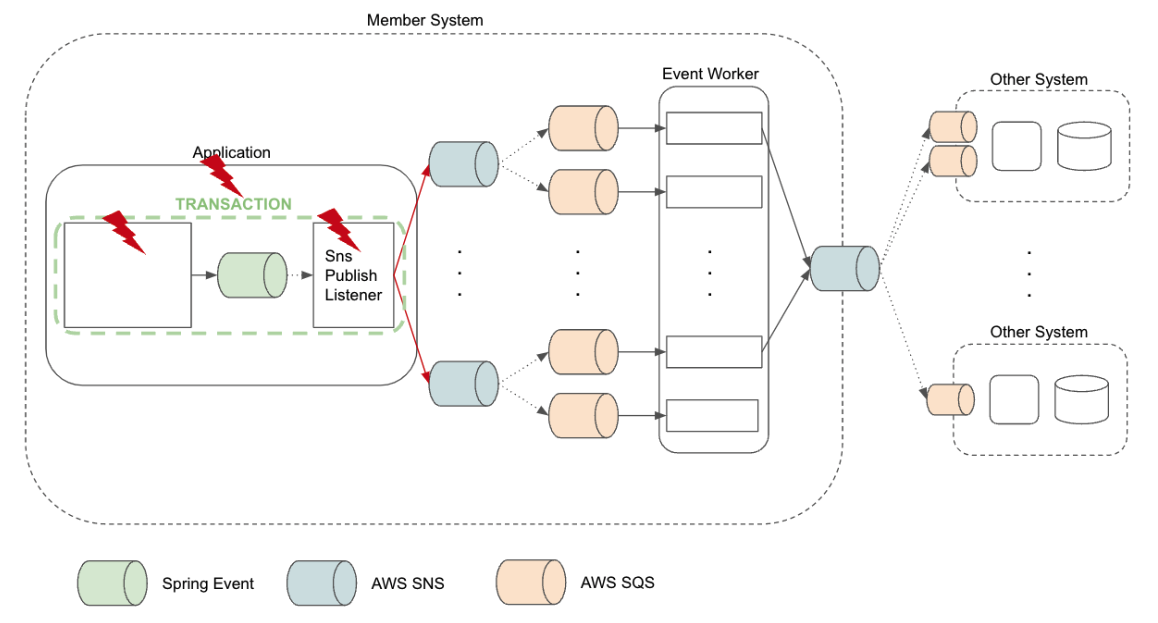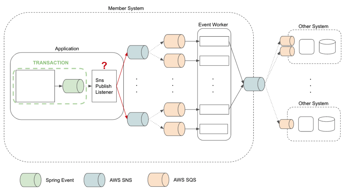 SNS-SQS-애플리케이션 구간에서는 SQS의 정책을 통해 안정적인 실패 처리, 재시도 처리가 가능하지만 애플리케이션-SNS 구간에서는 HTTP 통신을 사용하므로 이벤트 발행하는 과정에 문제가 발생할 수 있습니다. 내부 이벤트를 발행하는 과정을 트랜잭션 내부로 정의하면 메시징 시스템의 장애가 곧 시스템의 장애로 이러질 수 있기 때문에 이를 해결해야 합니다.