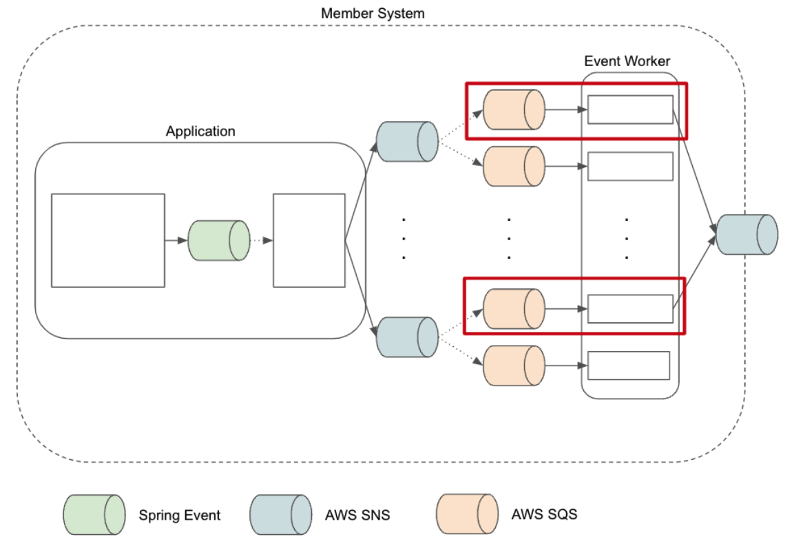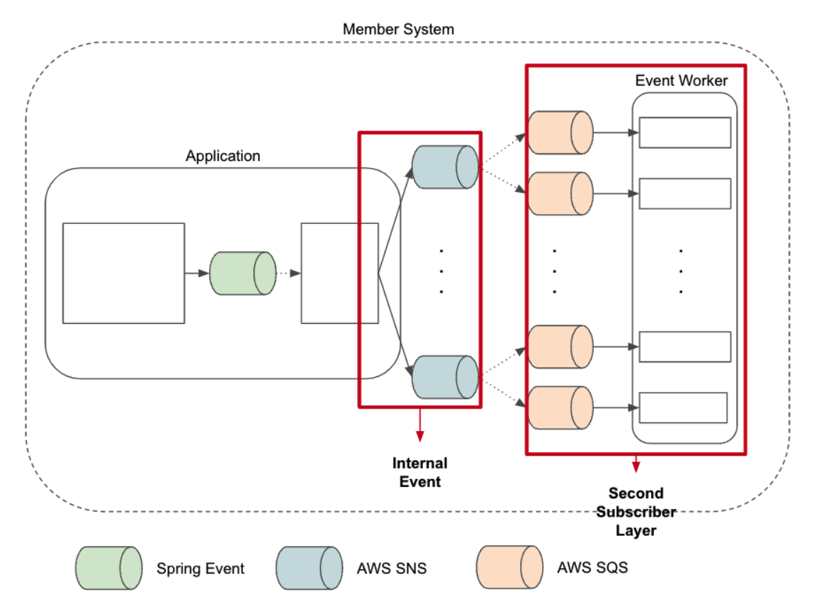 도메인 로직에서 관심사 로직을 제외한 모든 비관심사 로직은 이벤트 발행을 통해 처리하여 결합도를 낮춥니다. 이벤트 핸들러(첫 번째 구독자 계층)는 발행된 이벤트를 전달받아 AWS SNS로 전달합니다.