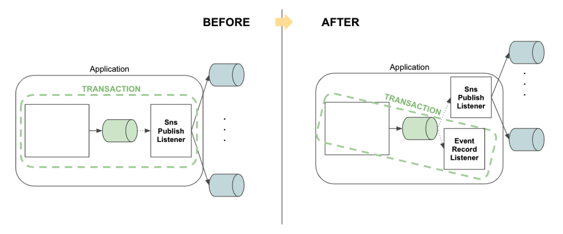 그러나 트랜잭션 외부에서 SNS로 메시지를 발행하는 동작이 처리되기 때문에 이벤트 발행에 대한 보장이 사라지게 되었습니다. 즉, 기존 로직이 SNS 발행 로직과 다른 스레드에서 돌기 때문에 발행 로직이 실패하더라도 기존 로직은 성공하기 때문에 이벤트 발행을 보장할 수 없다는 의미입니다.