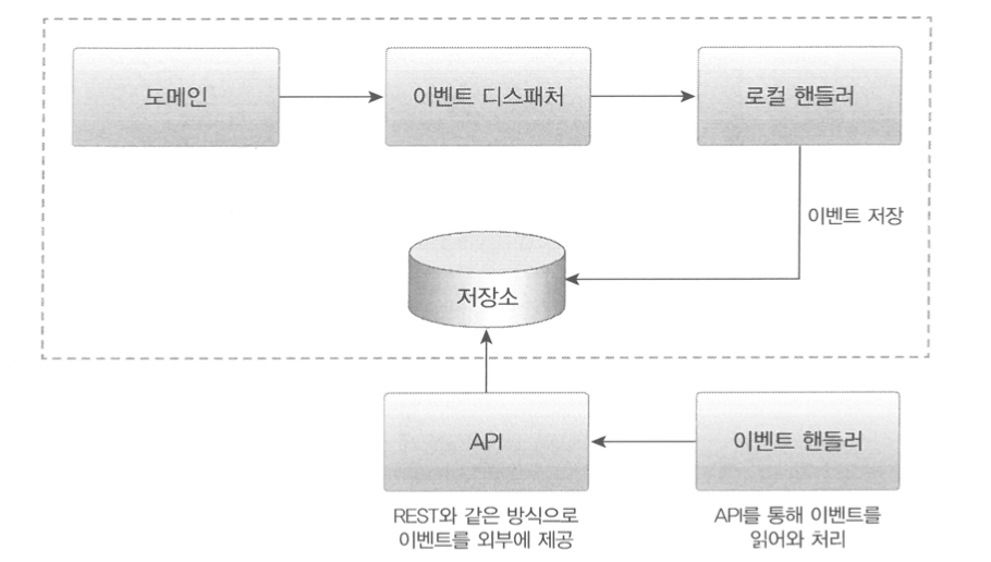 - 도메인 이벤트가 발생할 때 첫 번째 계층의 이벤트 저장 구독자는 트랜잭션을 확장하여 도메인 행위와 함께 이벤트가 저장소에 저장되게 됩니다.