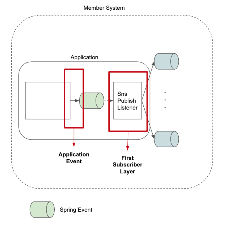 - 첫번째 계층의 SNS 발행 구독자는 AFTER_COMMIT 옵션으로 인해 도메인의 트랜잭션이 정상 처리되었을 때 SNS로 내부이벤트를 발행하게 됩니다.