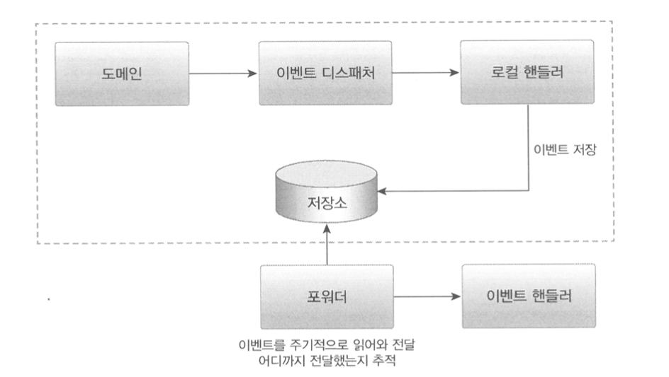 이벤트 저장소로 DB를 사용하는 경우에는 이벤트 발생 코드와 이벤트 저장 처리를 한 트랜잭션으로 처리하면 동일한 효과를 볼 수 있습니다. 이렇게 하면 트랜잭션이 성공할 때만 이벤트가 DB에 저장되므로, 트랜잭션이 실패했는데 이벤트 핸들러가 실행되는 상황은 발생하지 않습니다. 트랜잭션이 성공할 때만 이벤트 핸들러를 실행하게 되면 트랜잭션 실패에 대한 경우의 수가 줄어 이제 이벤트 처리 실패만 고려하면 됩니다. 이는 이벤트 특성에 따라 재처리 방식을 결정해서 해결하면 됩니다.