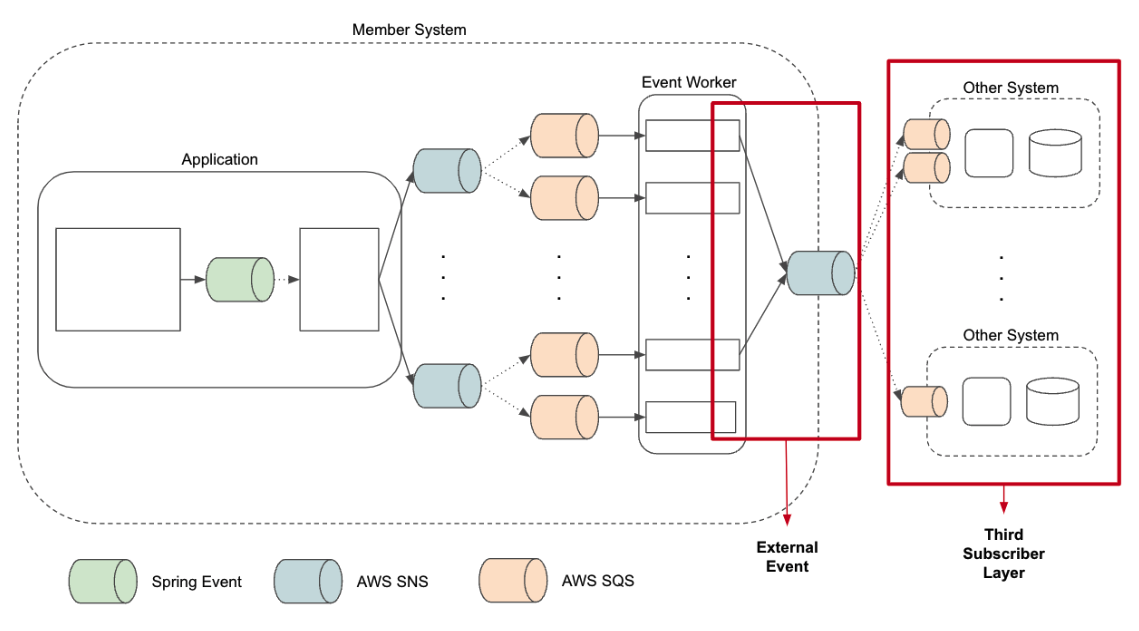 시스템 내의 비관심사를 분리했지만, MSA를 위한 외부 시스템과의 관심사 분리를 위한 외부 이벤트 발행이 필요할 수 있습니다. 외부 시스템에 이벤트를 전파하는 행위 또한 도메인 내에 존재하던 비관심사로 볼 수 있습니다. 외부 시스템에 이벤트를 전파하는 행위는 다른 내부 이벤트 처리와 동일하게 두 번째 구독자 계층의 SNS 발행을 책임지는 이벤트 구독자로부터 외부 이벤트가 발행됩니다. 즉, 두번째 구독자 계층에서는 비관심사 내부 로직을 처리하는 구독자와 외부 이벤트를 발행하는 구독자가 존재하는 것입니다.