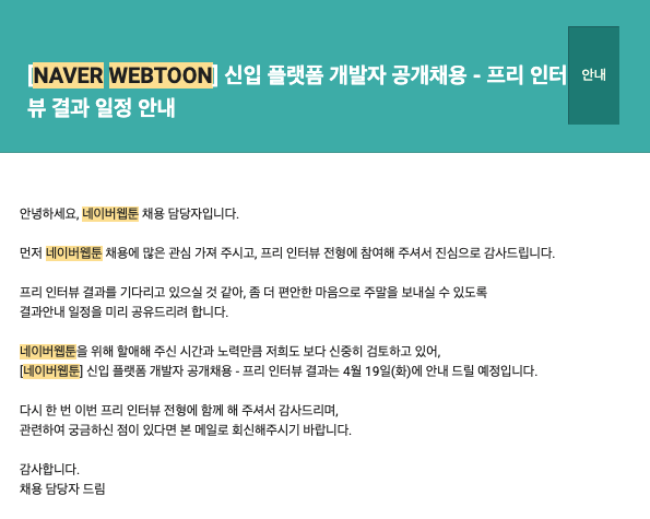 보통 채용 프로세스를 진행하다 보면 결과 발표에 대한 일정을 알려주지 않아 무작정 기다려야 하는 경우가 많습니다. 네이버 웹툰에서는 현재 결과 발표가 늦어지고 있고, 언제 발표 예정이라는 날짜까지 명확하게 안내해 준다는 점에서 지원자들을 배려해 주고 있다는 느낌을 받았습니다.