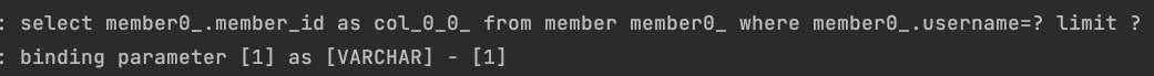 지금은 쿼리가 간단하고 하나의 파라미터만 들어가기 때문에 그나마 보기 편하지만, 쿼리가 복잡해지고 들어가는 파라미터가 많아지면 한 줄씩 쿼리 파라미터가 쭉 나열되기 때문에 확인하기 매우 불편합니다. 따라서 p6spy와 같은 외부 라이브러리를 사용하여 보기 쉽게 만드는 게 개발하기 편합니다.