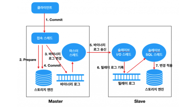 - Master Thread 는 시간에 구애받지 않고(비동기적으로) Binary Log 를 읽어서 Slave 로 전송한다.