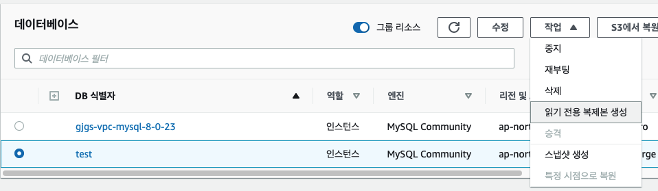 방금 생성한 DB를 선택하시고 읽기 전용 복제본을 생성해 줍니다. 기본 옵션으로 진행하면 되고 복제본 생성에서는 AZ 옵션을 꺼주시고, 퍼블릭 액세스를 허용해 줍니다.
