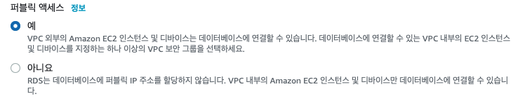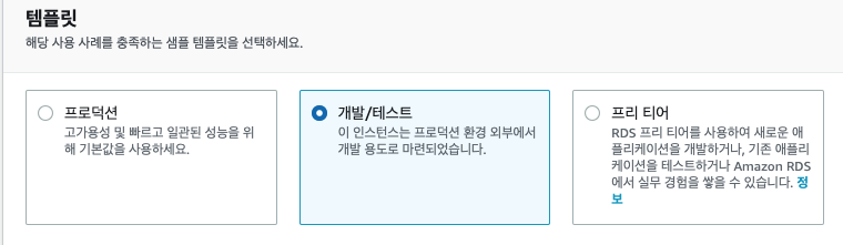 기본적인 RDS를 만들면 됩니다. 다중 AZ 배포 옵션은 프리티어에서 제공하지 않으므로 개발/테스트를 선택해 줍니다.