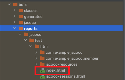 테스트를 돌리고 나면 build/reports/jacoco/test/html 폴더 안에 index.html 파일이 있습니다.