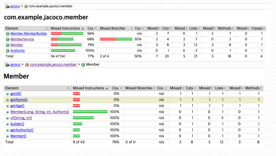 만들어진 html 리포트를 브라우저로 열면 다음과 같이 각 커버리지 항목마다 총 개수와 놓친 개수를 표시해 줍니다.
