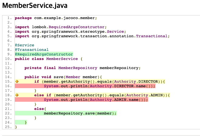 코드 파일에서는 커버가 된 라인은 초록색, 놓친 부분은 빨간색으로 표시해 줍니다. 노란색은 모든 조건이 아닌 일부만 테스트된 라인입니다. 위에서 보면 if와 else if 문은 false가 나오고 True는 나오지 않았기 때문에 일부만 테스트되었다고 노란색으로 표시된 것입니다.