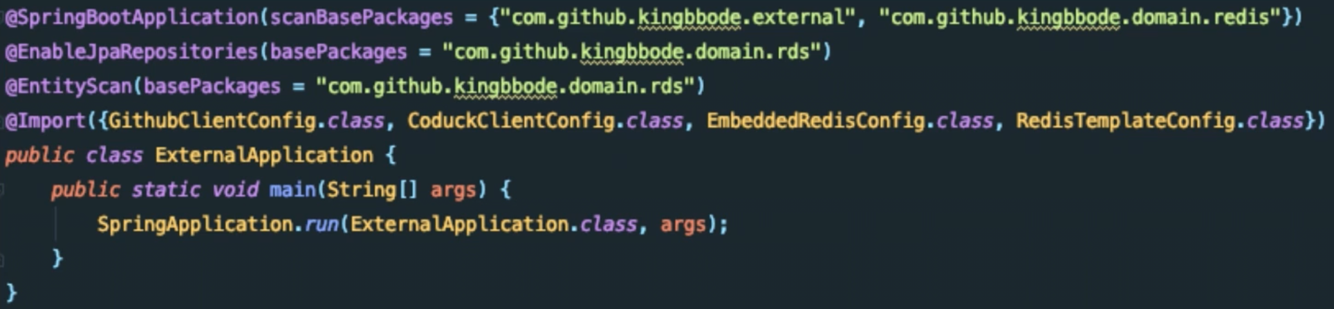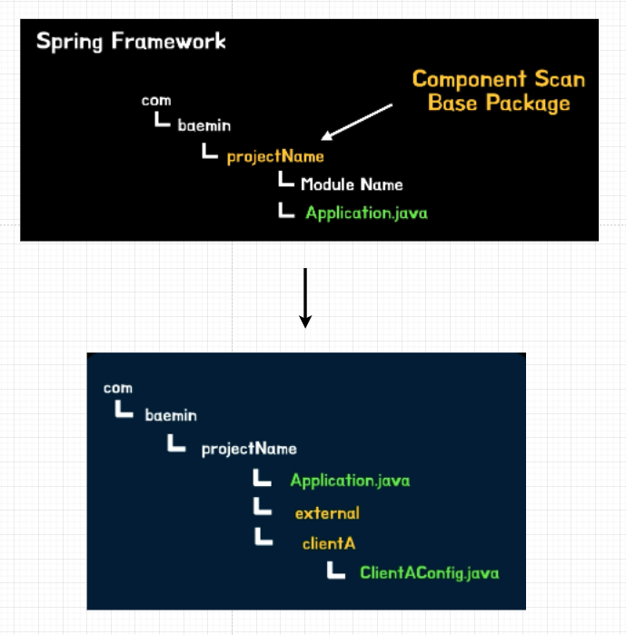 이 문제를 해결하기 위해 @SpringBootApplication에 옵션으로 여러 패키지를 추가하는 등의 작업을 해야 하는데 이 작업은 매우 번거롭고 실수하기 쉽습니다.