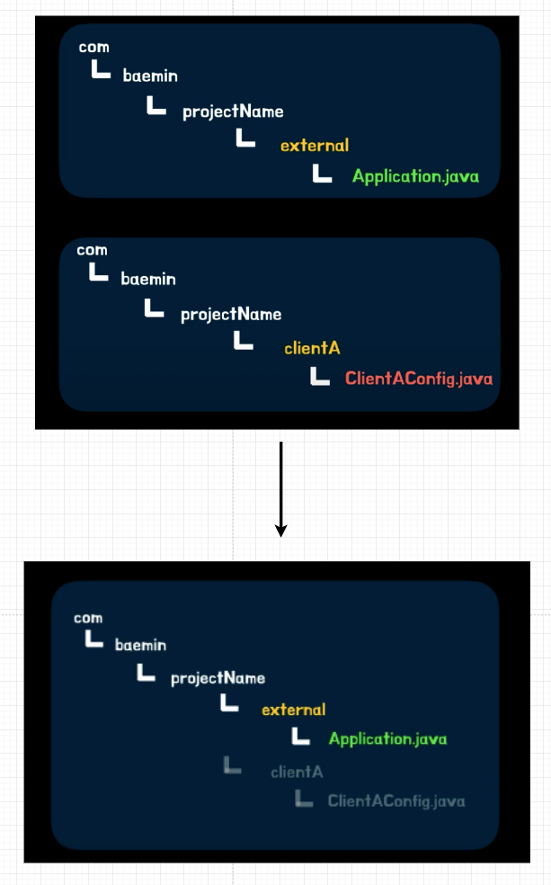 패키지 컨벤션에서 알 수 있듯이 멀티 모듈을 구성하게 되면 괴리감이 생기게 됩니다. 그림처럼 멀티 모듈을 합쳐 놓고 보면 Application.java의 범위(스캔 범위)에 다른 모듈이 포함되지 않는 문제가 발생합니다.
