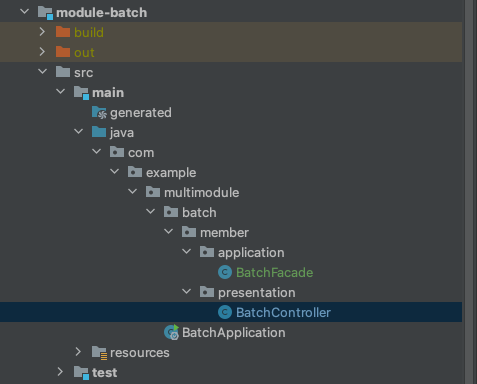 제가 정의한 module-batch는 어플리케이션 모듈 계층으로 core 도메인 모듈을 조합해서 사용하는 최종 모듈입니다.