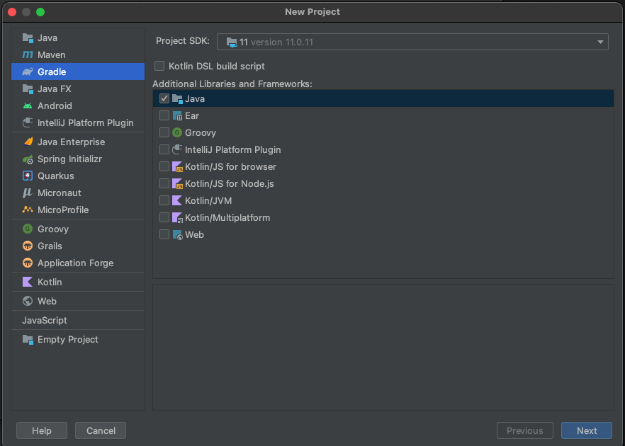 Gradle로 새로운 프로젝트를 만들어줍니다. 방금 만든 새로운 프로젝트가 모든 프로젝트의 Root가 됩니다.