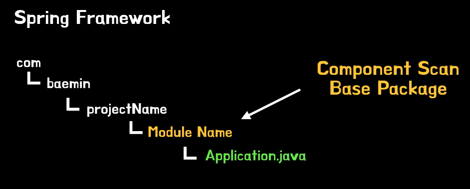 패키지 컨벤션으로 위와 같은 구조로 잡는다고 가정한다면 Application.java를 기준으로 해당 클래스가 속해 있는 패키지가 componentScan의 base Package가 되면서 그 하위를 스캔하게 됩니다.
