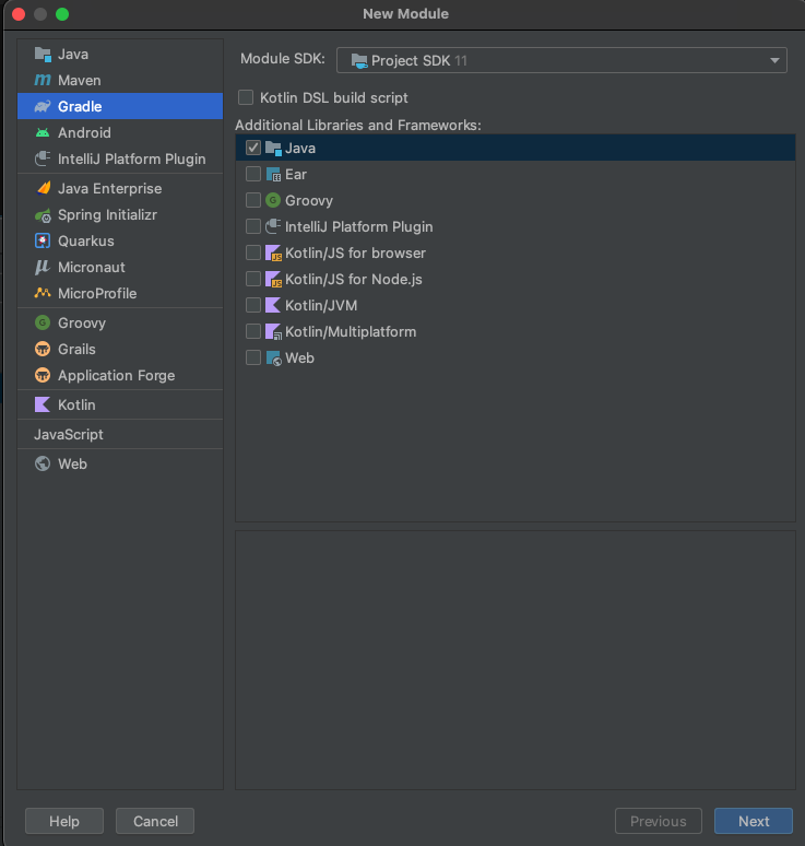 Gradle을 선택하고 만들어줍니다. 이 과정을 반복해서 여러 개의 모듈을 만들어줍니다. 저는 core, batch, web 모듈을 만들었습니다.