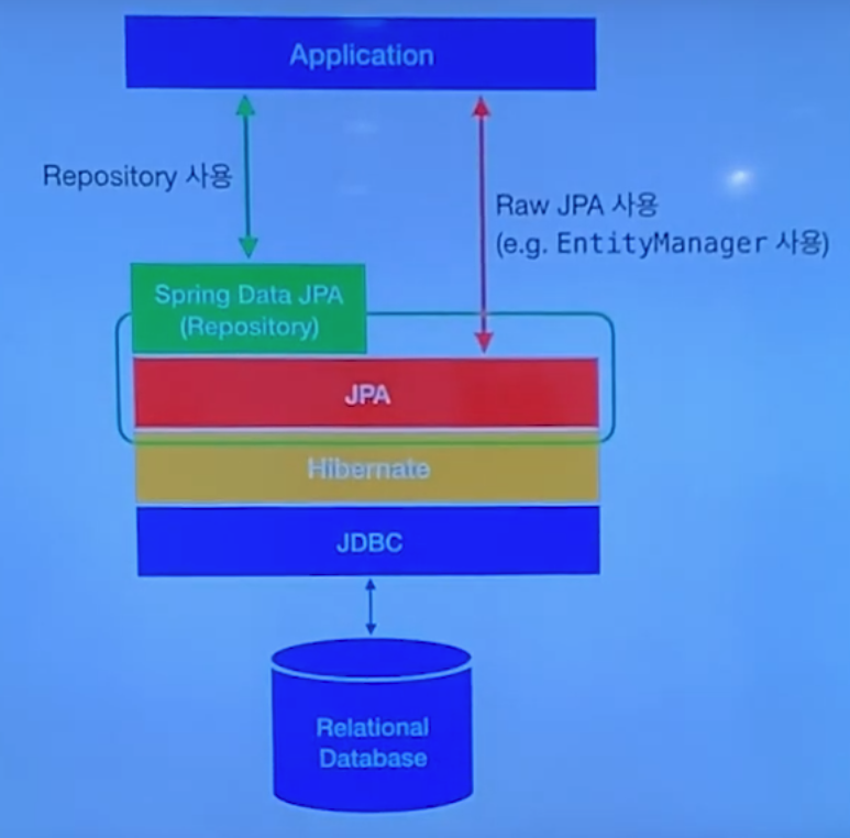 일반적으로 개발자들이 사용하게 되는 JPA는 Spring Data JPA입니다. EntityManager 사용이 복잡하고 번거로운 부분이 많으니 이를 Repository라는 개념으로 한 단계 더 추상화한 것이 Spring Data JPA입니다.