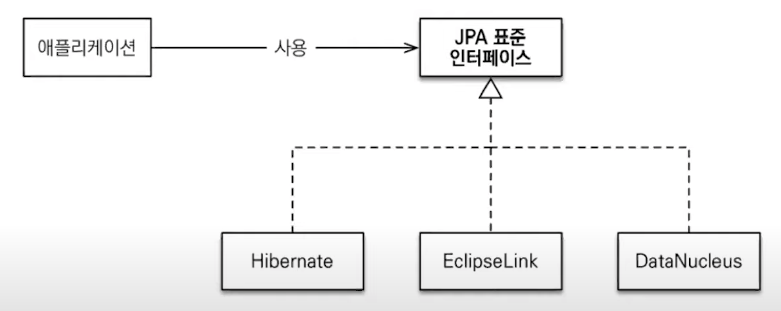 객체지향의 복잡한 구조를 데이터베이스에 어떻게 하면 넣을 수 있을까 하는 API 명세가 JPA 인퍼테이스 입니다. 그리고 해당 인터페이스를 구현한 구현체가 Hibernate , EclipseLink, DataNucleus 입니다.