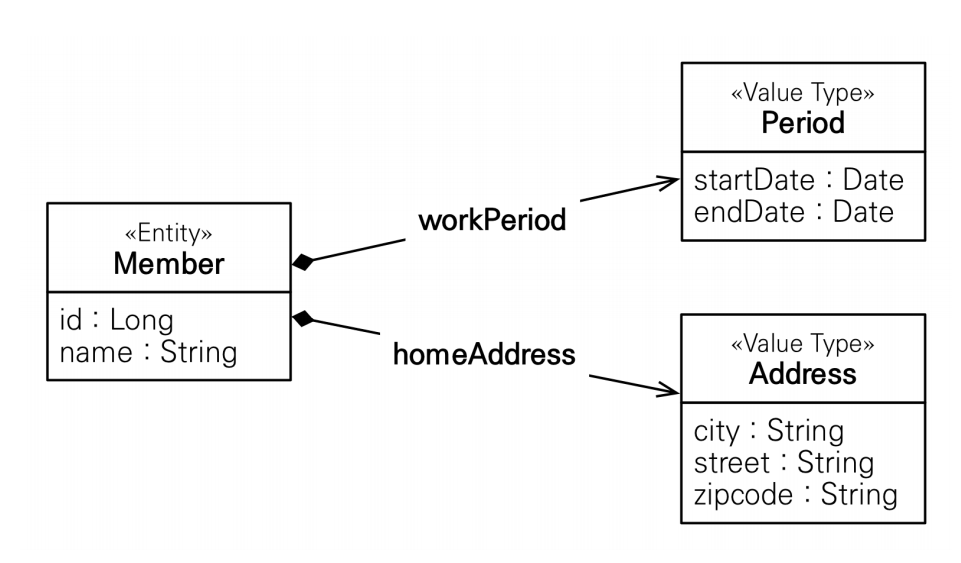 기본 값 타입(자바 기본 타입(int ..) & 래퍼 클래스(Integer ..))을 모아서 하나의 클래스로 만들어 놓은 것을 JPA에서는 임베디드 타입이라고 합니다. 예를 들면, Entity에 id, name, startDate, endDate, city, street, zipcode 필드가 있다면 기간과 주소는 별도의 class로 만들어 두고 필요한 Entity에서 이를 가져와서 사용하게 할 수 있게 해주는 것입니다. 따로 뽑아낸 클래스에는 @Embeddable 애노테이션을 붙여 값 타입을 정의하는 곳으로 표시해 두고, Entity에서 사용할 때는 @Embedded 애노테이션을 사용해서 값 타입을 사용한다고 표시해 줍니다. 이렇게 따로 클래스로 관리해 주면 이에 대한 의미 있는 메서드도 만들 수도 있고 재사용도 편리해집니다. 생명주기는 소유한 엔티티에 의존하며, 임베디드 타입도 엔티티처럼 스펙상 기본 생성자는 꼭 있어야 합니다. 참고로 임베디드 타입의 값으로 Entity를 가질 수도 있습니다.