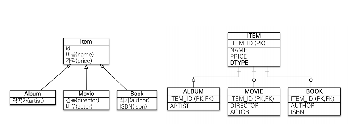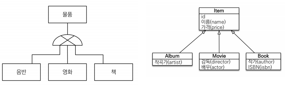 객체 관점에서 Item은 혼자 사용되는 경우가 없는 추상 클래스이고, album, movie, book이 이를 상속받아서 사용하는 것이라고 가정합시다.