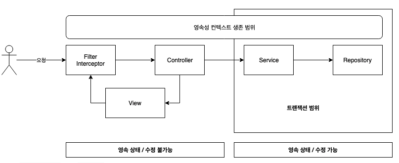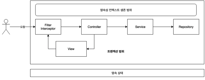 - 클라이언트의 요청이 오면 서블릿 필터나 스프링 인터셉터에서 영속성 컨텍스트를 생성합니다. 트랜잭션을 시작하지는 않습니다.