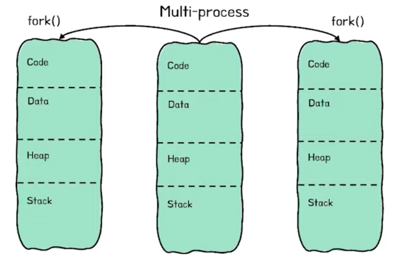 하나의 프로그램을 여러개의 프로세스로 구성하여 각 프로세스가 병렬적으로 작업을 수행하는 것을 의미합니다. 한 애플리케이션에서 여러 사용자가 로그인을 요청하는 상황이 있다고 가정해 봅니다. 한 프로세스는 매번 하나의 로그인만 처리할 수 있기 때문에 동시에 처리할 수 없습니다. 그래서 부모 프로세스가 fork() 하여 자식 프로세스를 여러 개 만들어 일을 처리하도록 합니다. 이때 자식 프로세스는 부모와 별개의 메모리 영역을 확보 하게 됩니다.