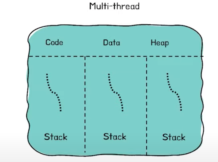 하나의 프로세스에 여러 스레드로 자원을 공유하며 작업을 나누어 수행하는 것을 의미합니다. 스레드는 한 프로세스 내에서 구분지어진 실행 단위입니다. 만약 프로세스가 다수의 스레드로 구분되어있지 않다면 단일 스레드 하나로 프로세스가 실행됩니다.