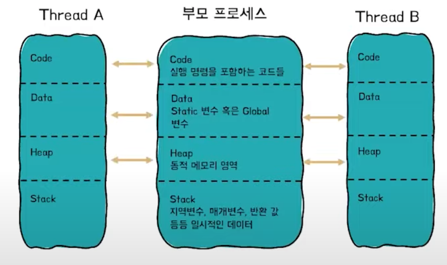 - 멀티 프로세스는 독립적인 메모리를 갖고 있지만, 멀티 스레드는 자원을 공유한다.