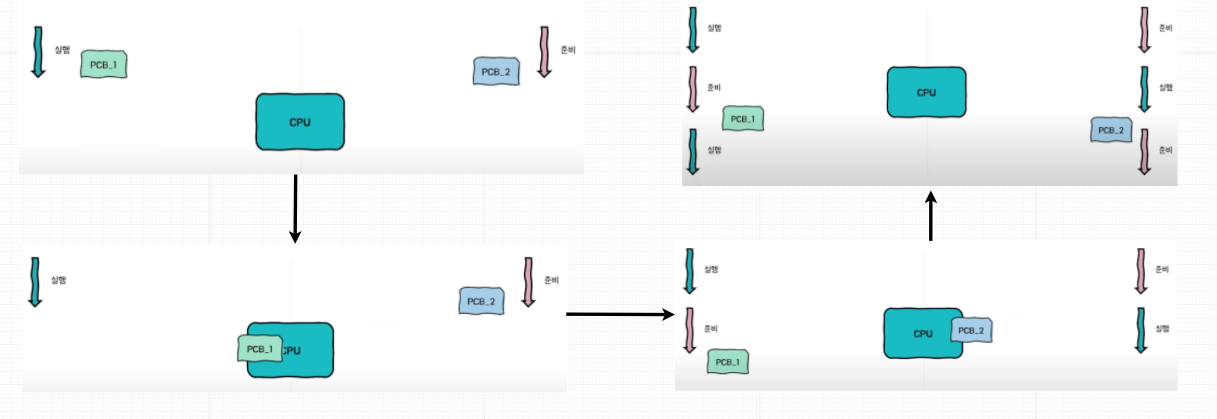 위 그림을 화살표 방향대로 보시면 처음에는 PCB_1이 실행상태로 CPU에 적재되고, PCB_2가 실행상태로 되기 위해서는 PCB_1이 다시 준비 상태로 내려가게 됩니다. 이런 일련의 과정을 매우 짧은 텀으로 반복하게 되는 것입니다. 이러한 행위를 컨텍스트 스위칭 이라고 합니다. 두 개의 프로세스의 컨텍스트 스위칭을 봤는데도 매우 힘든 작업인 것을 알 수 있습니다.