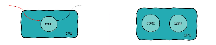 - 멀티 코어는 하드웨어 측면에서 실행 단위를 병렬적으로 처리할 수 있도록 여러 프로세서가 있는 것이다.