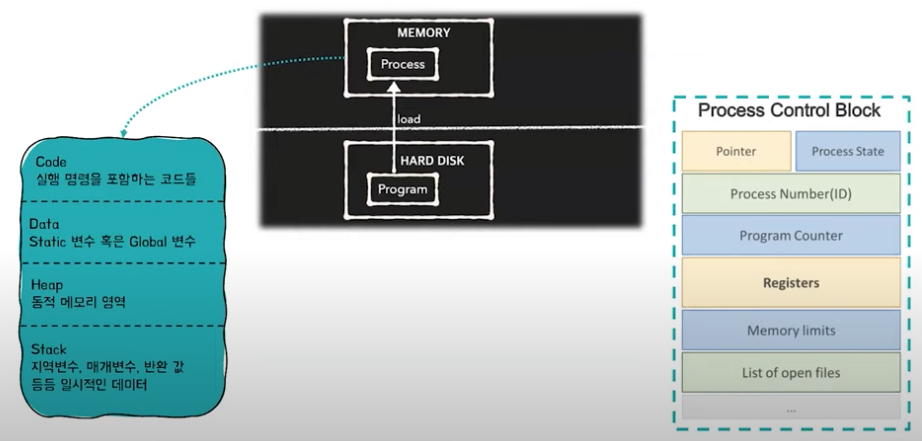 프로그램이 프로세스가 되면서 총 2가지 일이 발생합니다. 프로세스가 필요로 하는 재료들이 메모리에 올라가야 합니다. 메모리는 Code, Data, Heap, Stack 으로 총 4가지 영역으로 구성되어 있습니다. 또한, 해당 프로세스에 대한 정보를 담고 있는 Process Control Block(PCB)가 프로세스 생성 시 함께 만들어 집니다.