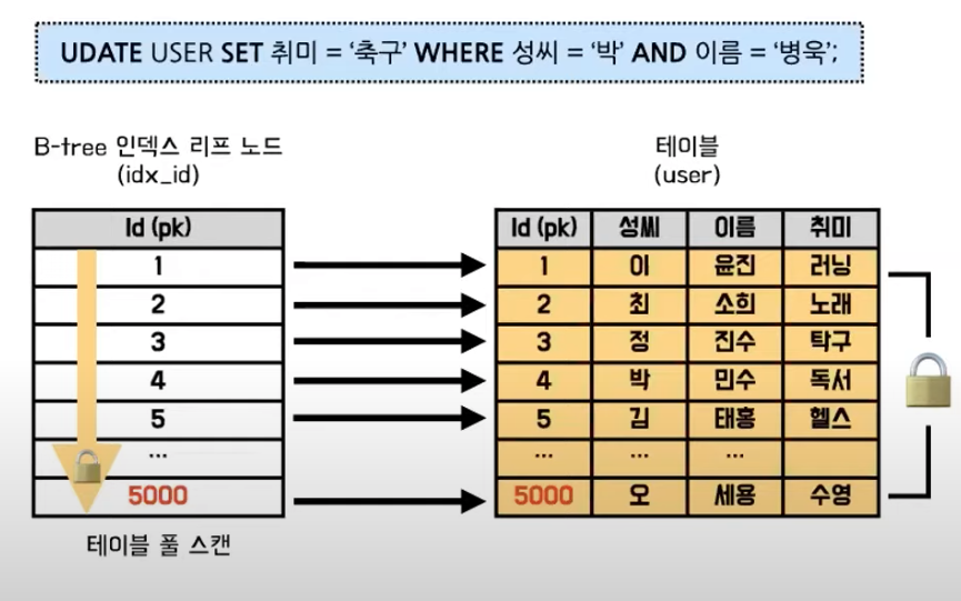 만약 성씨 인덱스가 없었다면 기본으로 생성된 PK 인덱스를 사용하여 테이블을 풀스캔하게 되면서 5000 개의 데이터에 대해 잠금이 걸리게 됩니다.
