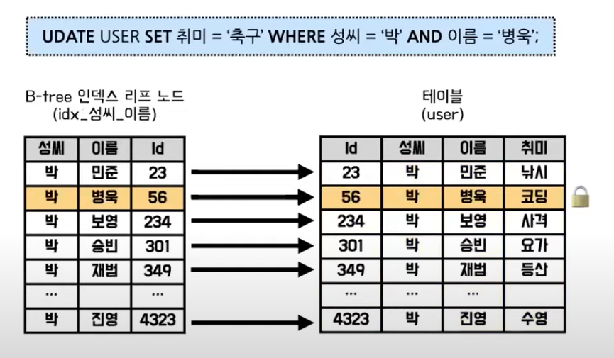 만약 성씨와 이름에 대한 복합 인덱스를 생성했다면 딱 한 개의 레코드에 대해서만 잠금이 걸리게 됩니다.