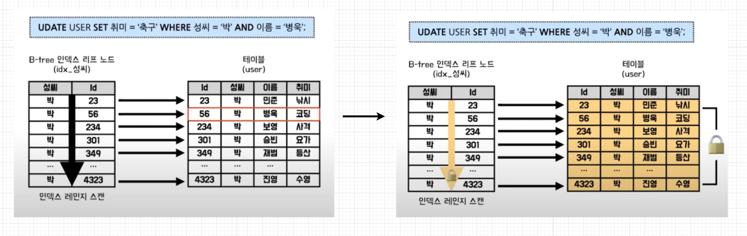 업데이트할 레코드를 검색할 때 사용된 박 씨 인덱스 레코드가 모두 잠기게 됩니다.