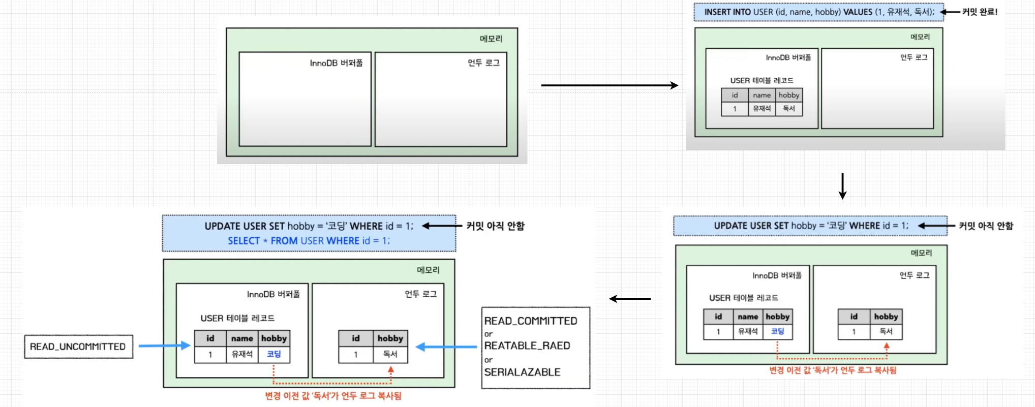 - READ_UNCOMMITTED 라면 InnoDB 버퍼풀 값을, READ_COMMITTED, REATABLE_READ, SERIALAZBLE 이라면 언두 로그에 있는 값을 읽습니다.