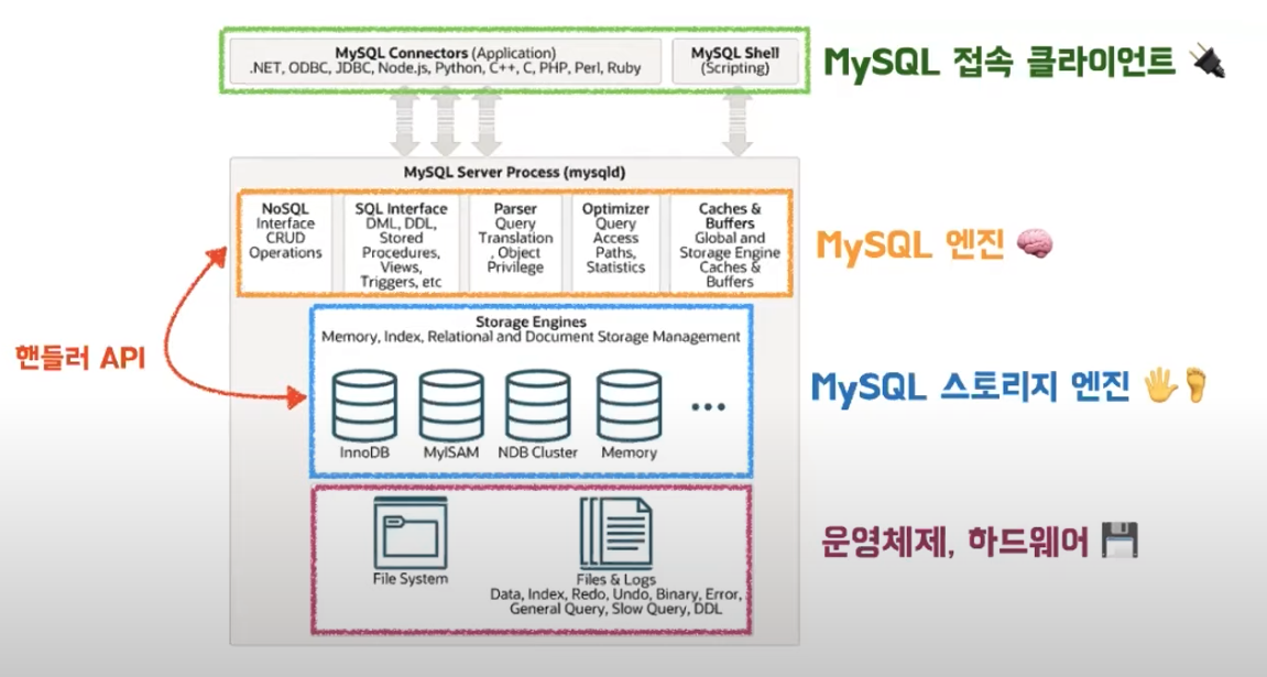 - 쿼리 파서, 전처리기, 옵티마이저(요청된 SQL문을 최적화해서 실행하기 위한 실행계획을 짜는 역할), 실행 엔진 등으로 구성