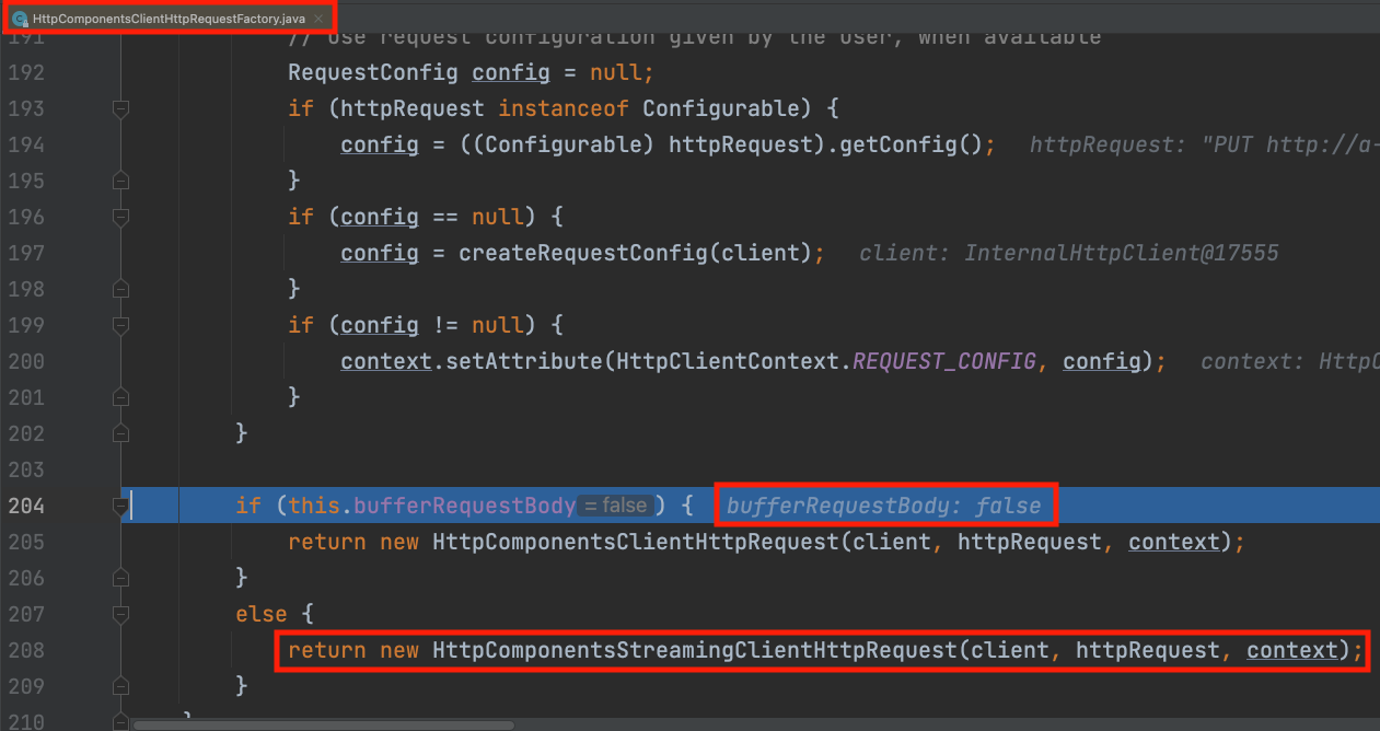 equestCallback 부분의 request부터 디버깅을 따라가다 보면 HttpComponentsClientHttpRequestFactory 클래스의 createRequest() 메소드를 호출하고 있습니다. 해당 메서드 코드를 보면 앞전에 restTemplate 설정에서 bufferRequestBody를 false로 두었기 때문에 else 분기를 타게 되면서 HttpComponentsStreamingClientHttpRequest를 생성하게 됩니다.