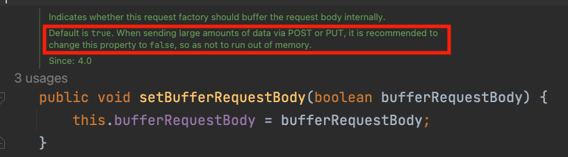 그럼 여기서 이 false 옵션이 도대체 무엇인지 봅시다. 주석에 의하면 POST, PUT을 통해 대량의 데이터를 전송할 때는 메모리가 부족하지 않도록 해당 속성을 false로 변경하라고 되어있습니다. 기본값인 true로 설정하면 요청 본문을 메모리에 버퍼링 합니다. 이는 요청을 보내기 전에 전체 본문을 메모리에 저장하고, 그 후 HTTP 요청을 보내는 방식입니다. false의 경우 데이터는 메모리에 버퍼링 되지 않고 직접 네트워크를 통해 전송됩니다.