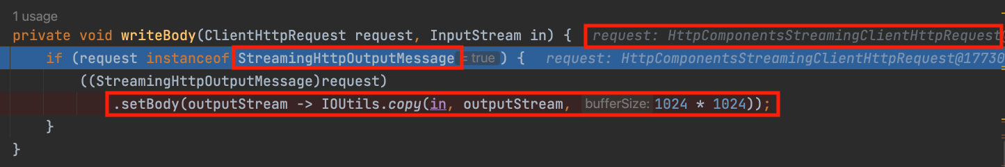 requestCallback쪽을 보면 instaceof로 StreamingHttpOutputMessage로 형변환하는 것이 있는데 HttpComponentsStreamingClientHttpRequest는 StreamingHttpOutputMessage의 구현체이기 때문에 가능합니다. data.transferTo 메서드를 통해 inputstream을 outputStream으로 write 작업 수행합니다.