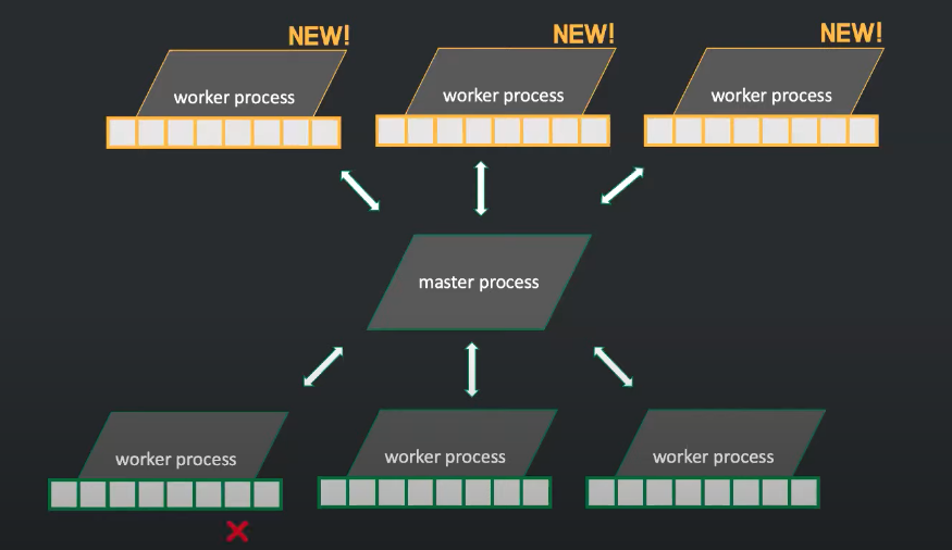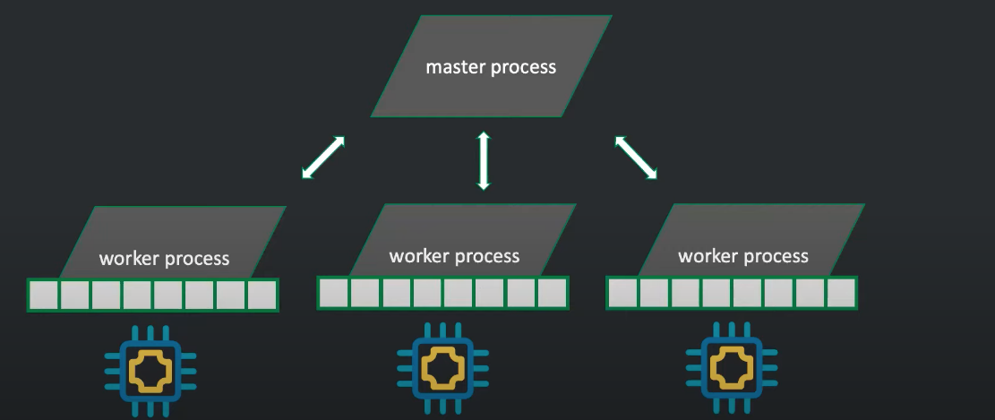 보통 워커 프로세스는 cpu의 코어개수만큼 생성합니다. 이러면 코어가 담당하는 프로세스를 바꾸는 횟수를 대폭 줄일 수 있습니다. 즉, cpu가 컨텍스트 스위칭 사용을 줄일 수 있게 되는 것입니다. 이것이 엔진엑스가 채택한 이벤트 기반 구조로 아파치 서버와 가장 큰 차이점입니다.