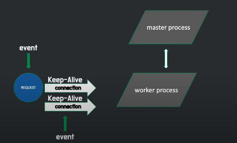 엔진엑스는 마스터 프로세스에서 설정파일을 읽고 설정에 맞게 워커 프로세스를 생성하고 워커 프로세스는 실제로 일을 하게 됩니다. 워커 프로세스는 클라이언트로부터 요청이 들어오면 커넥션을 생성하고 Keep-Alive 시간만큼 커넥션을 유지하면서 요청을 처리합니다. 그런데 커넥션이 형성되었다고 해서 워커 프로세스가 커넥션을 하나만 담당하진 않습니다. 형성된 커넥션에 아무런 요청이 없으면 새로운 커넥션을 형성하거나 이미 만들어진 다른 커넥션으로부터의 요청을 처리합니다. 엔진엑스에서는 이런 커넥션 형성, 커넥션 제거, 새로운 요청을 처리하는 것을 이벤트라고 부릅니다.