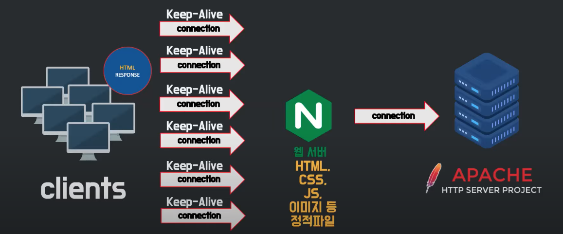 이러한 구조를 보완한 nginx가 등장합니다. 초창기에는 아파치 서버와 함께 사용하기 위해 만들어졌습니다. 아파치 서버의 구조적 한계를 극복하기 위해 아파치 서버 앞에 두면서 기존에 아파치 서버가 감당했던 수많은 동시커넥션을 엔진엑스가 받도록 하는 것입니다. 엔진엑스는 웹서버이기 때문에 정적인 처리는 스스로 했고, 동적 파일 요청을 받았을 때만 아파치 서버와 커넥션을 만들어 처리했습니다. 아파치의 리소스를 커넥션 유지에 쓰지 않고 실제 로직 처리에 사용하도록 하는 구조로 말입니다.