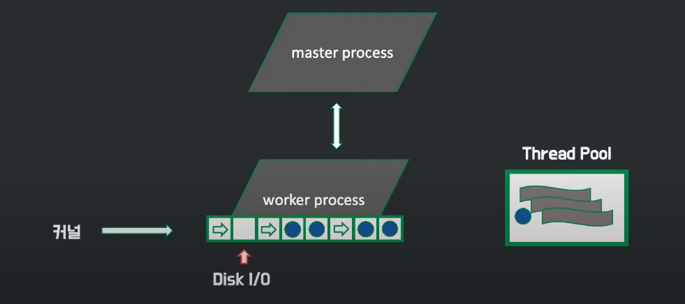 이벤트들은 OS 커널을 통해 큐형식으로 워커 프로세스에게 전달됩니다. 이벤트는 큐에서 워커 프로세스가 처리할 때까지 비동기 방식으로 대기합니다. 워커 프로세스는 하나의 스레드로 이벤트를 꺼내서 처리하게 되면서 쉬지 않고 일하는 장점을 가져가게 됩니다. 아파치 서버 구조와 비교했을 때 요청이 없다면 방치되는 프로세스보다 훨씬 효율적으로 서버자원을 쓰는 셈입니다. 만약 요청 중 하나가 시간이 오래 걸리는 작업이라면 시간이 오래걸리는 작업을 따로 수행하는 쓰레드풀을 만들어 놓고 오래걸리는 작업은 스레드풀에게 이벤트를 위임하고 다음 이벤트를 수행합니다.