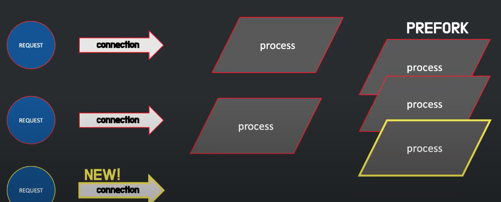 최초의 웹서버 NCSA에 수많은 버그로 인해 이를 보완한 아파치 서버가 등장합니다. 아파치 서버는 요청이 들어오면 커넥션을 형성하기 위해 프로세스를 생성하는 방식으로 새로운 클라이언트 요청이 들어올 때마다 새로운 프로세스를 생성합니다. 프로세스를 만드는 작업은 오래 걸리므로 미리 프로세스를 만들어 놓는 prefork 방식을 사용합니다. 만약 미리 만들어 놓은 프로세스가 모두 할당되었다면 추가로 프로세스를 만들게 됩니다. 이런 구조로 인해 개발자는 다양한 모듈을 만들어 빠르게 기능을 추가할 수 있게 되었고 동적 콘텐츠도 처리할 수 있게 되었습니다. 또한 확장성이 좋다는 장점 때문에 요청을 받고 응답하는 과정을 하나의 서버에서 처리하기도 좋아지면서 아파치가 대세로 자리 잡습니다.