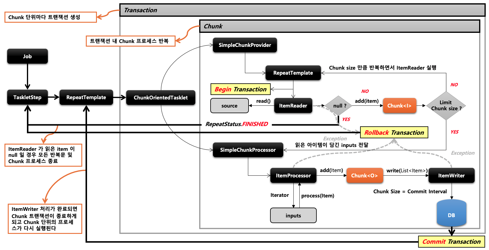 중간에 예외가 발생한다면 트랜잭션 롤백이 발생하고 작업이 중단되며, ItemReader에서 null값을 읽어오게 된다면 RepeatStatus.FINISHED를 통해 현재 작업을 마지막으로 다음부터는 반복 작업이 일어나지 않게 됩니다. Chunk 단위마다 새로운 트랜잭션 이 생성되고 커밋되는 과정이 존재하는 것을 알아둡시다.