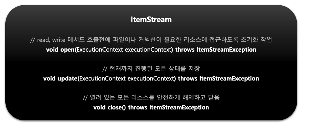 - ItemStream은 파일 스트림 연결 종료, DB 커넥션 연결 종료 등의 장치 초기화 등의 작업에 사용됩니다.