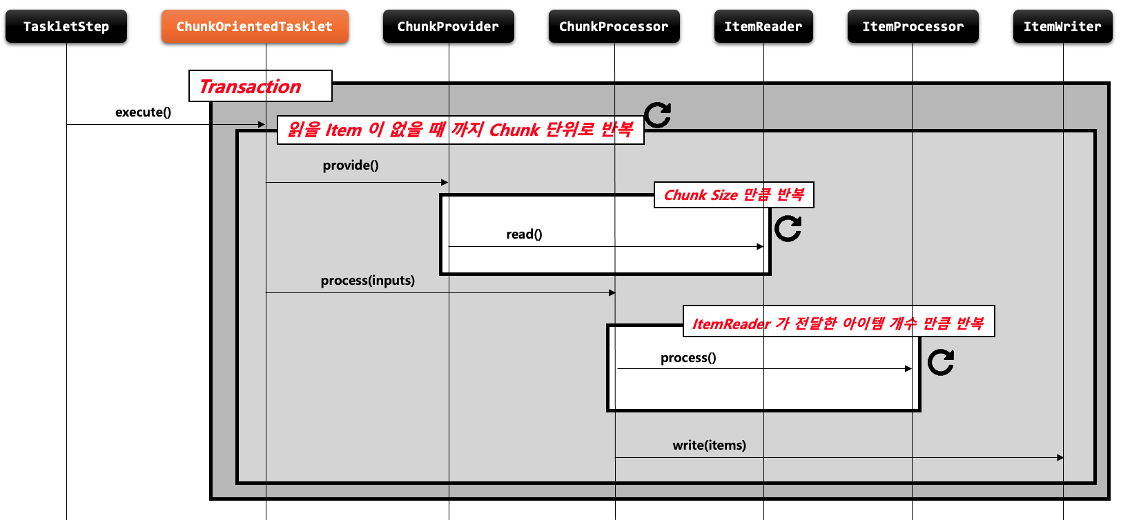 - TaskletStep에 의해서 반복적으로 실행되며, ChunkOrientedTasklet이 실행될 때마다 매번 새로운 트랜잭션이 생성되어 처리됩니다.