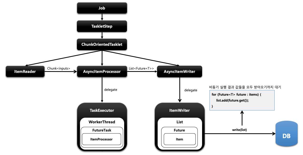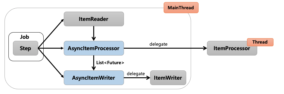 AsyncItemProcessor는 ItemProcessor에 실제 작업을 위임합니다. TaskExecutor로 비동기 실행을 하기 위한 스레드를 만들고 해당 스레드는 FutureTask를 실행합니다. FutureTask는 Callable 인터페이스를 실행하면서 그 안에서 ItemProcessor가 작업을 처리하게 됩니다. 이런 하나의 단위를 AsyncItemProcessor가 제공해서 처리를 위임하고 메인 스레드는 바로 다음 AsyncItemWriter로 넘어갑니다. AsyncItemWriter도 ItemWriter에게 작업을 위임합니다. ItemWriter는 Future 안에 있는 item들을 꺼내서 일괄처리하게 되는데 이때 Processor에서 작업 중인 비동기 실행의 결괏값들을 모두 받아오기까지 대기합니다.