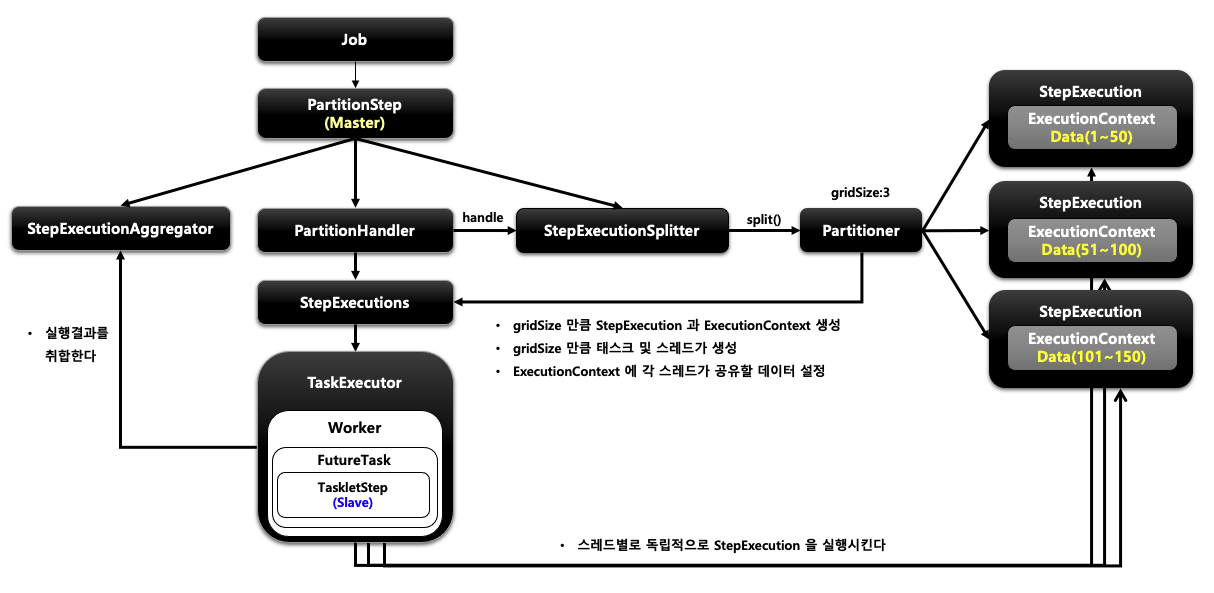 - 매니저(Master)가 partitioner를 사용하여 각각의 slave에 넘겨줄 데이터 범위를 결정하고 Slave는 해당 데이터를 Chunk 단위로 독립적으로 처리하는 방식